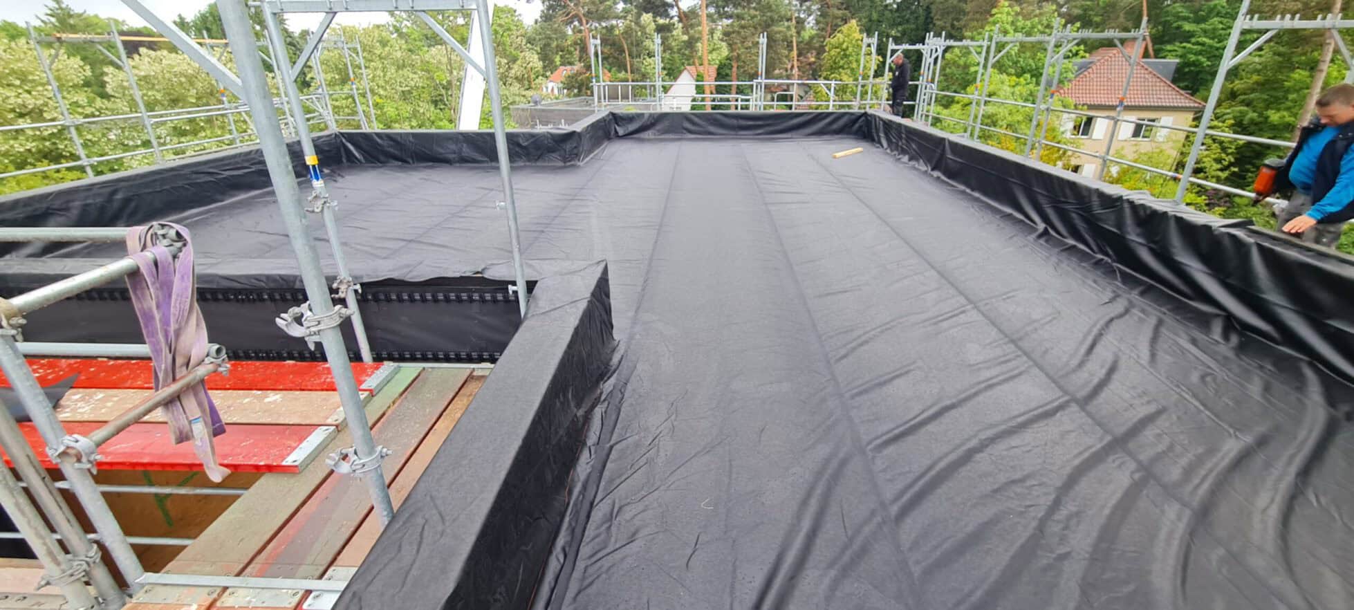 Flachdach sowie Bodenplatte dichten wir mit EPDM-Bahnen ab.